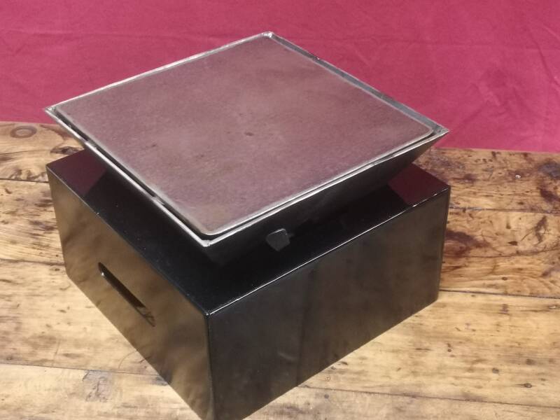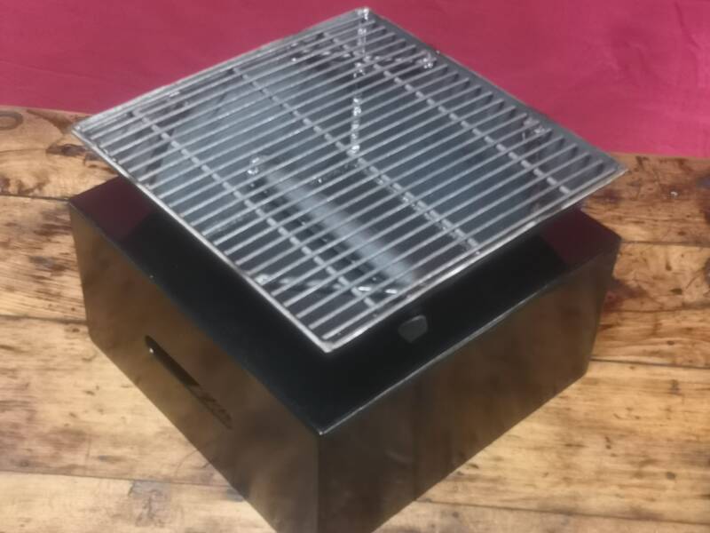 Braséro de table 2 ou 4 personnes. Structure acier 3 mm avec peinture haute température sur parties extérieures. Partie four non peinte mais huilée. Plancha en acier 5 mm. Hauteur totale 20 cm.