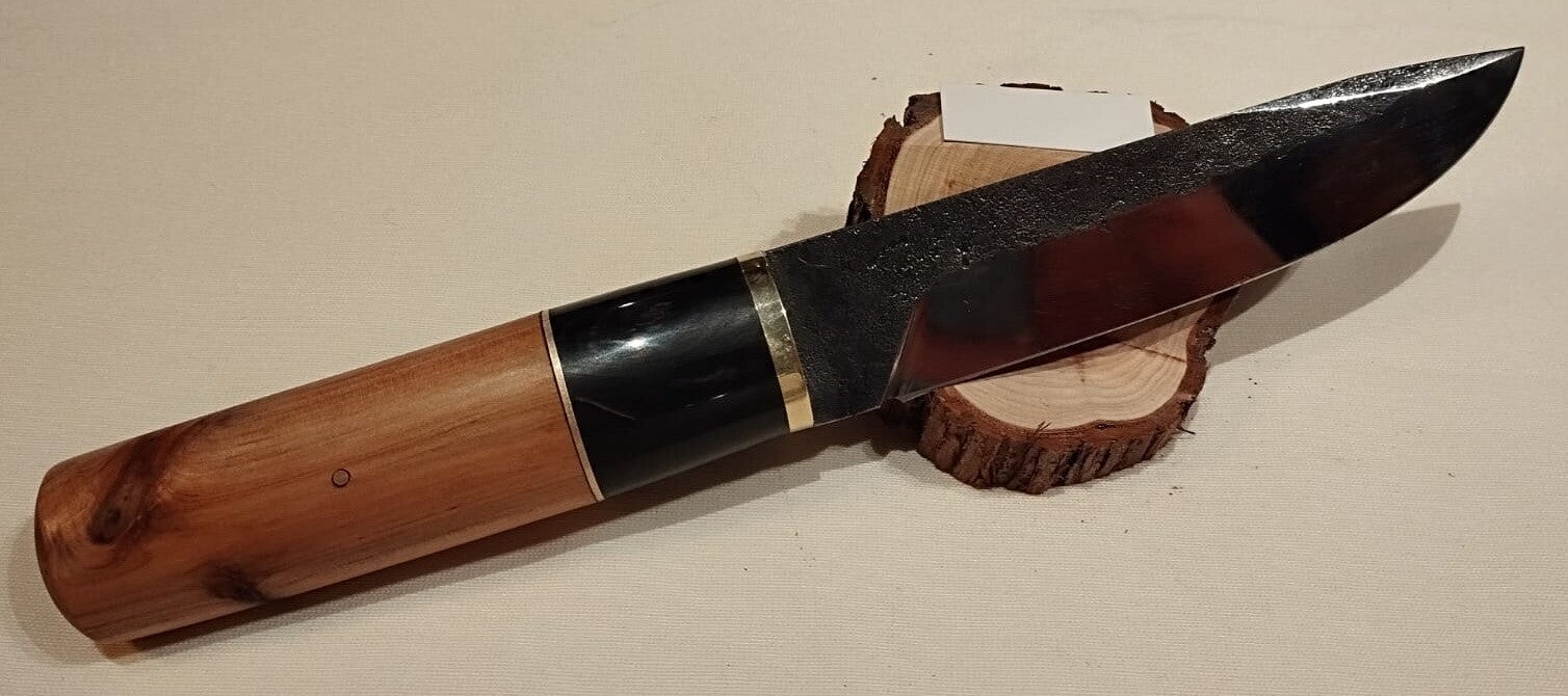Couteau de cuisine lame acier W2 (135Cr3) de 19 cm pour une épaisseur maximale de 2 mm et une hauteur au talon de 35 mm. Le manche est long de 12,5 cm réalisé en corne de zébu, laiton et genévrier.