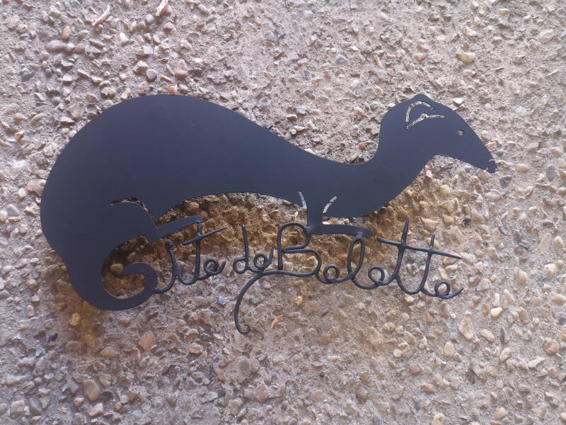 Enseigne acier peint 3mm et texte rond forgé. Fixation au mur par vis cachés.