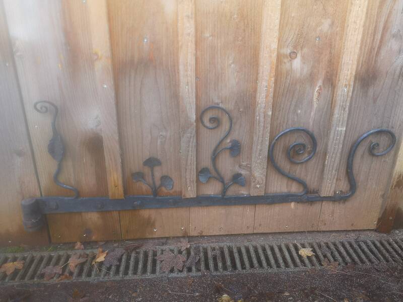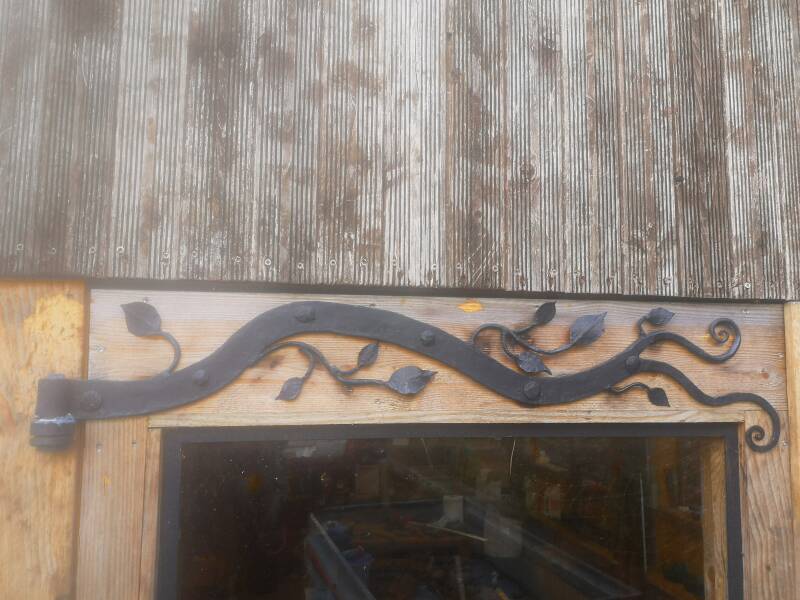 Ferrures de portes d'atelier en plat 8 mm forgé peint. Décor acier forgé peint. Fixation dans l'ouvrant par clous forgés.