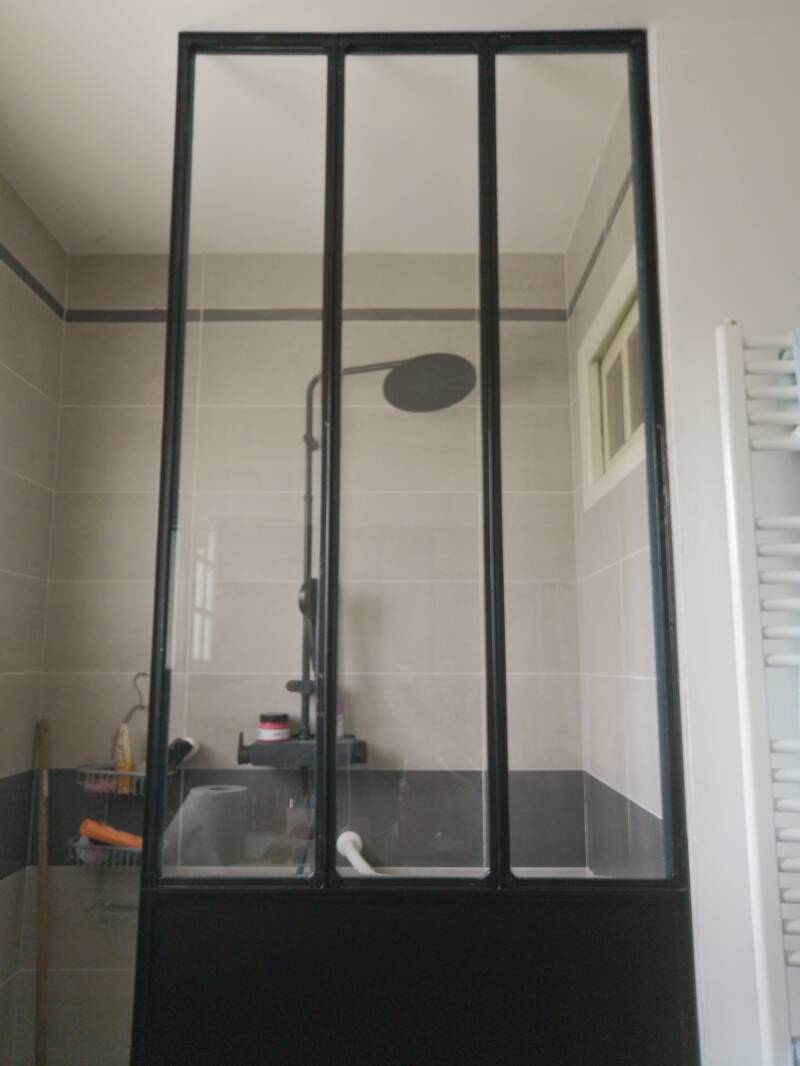 Verrière posée en paroi de douche. Structure acier 3 mm traitée anticorrosion. Allège acier 3mm sur 1000 mm de hauteur. Verre clair de 5 mm. Paroi de 90 cm sur 260 cm de hauteur.